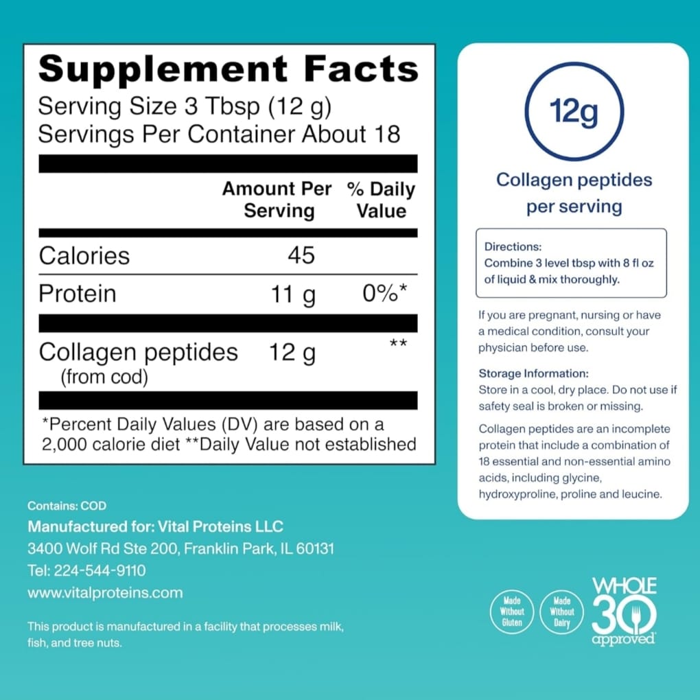 - Key Nutritionals Per Serving: Marine collagen peptides can be digested and absorbed by the body quickly for maximum benefits. 12g collagen peptides helps support healthy hair, skin, nails, bones, joints, ligaments and tendons.